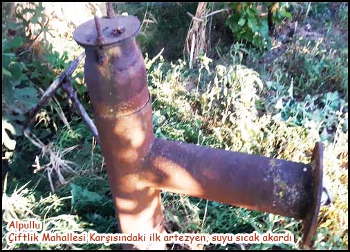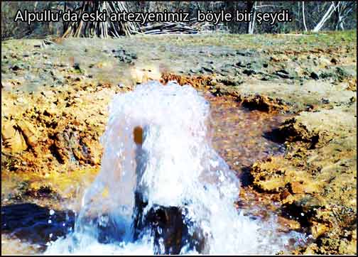 Artezyen nedir? Sondaj sonucunda veya kendiliğinden topraktaki yarıkları izleyerek yeraltındaki suyun yeryüzüne çıkması... Alpullu'nun ilk artezyenleri sondaj yapıldığında doğal kaynak suyu gibi kendiliğinden yeryüzüne çıkıyor imiş. Sonraları su yeryüzüne çıkmayınca dalgıç motorlarla yukarı çekmeye başlamışlar.
