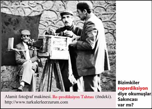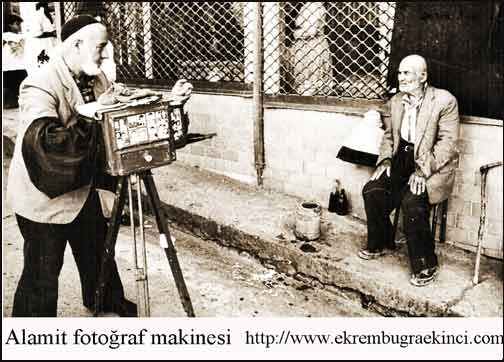 Makedonya'nın Kırçova şehrinden göçmen gelen Selahattin Gül anlatıyor. Adı öyleymiş... Alamit fotoğraf makinesi deniyormuş ona. Alamit makinesinin arka tarafındaki kara bezin adı karamando, arap fotoğraftan pozitif elde etmeye yarayan düzeneğin adı roperdiksiyon tahtası... Kartın takıldığı bölümün adı şase... İçinde bulunan küçük bir kutudaki ilaçlı suda filmin yıkandığı kafesin adı entermidate...