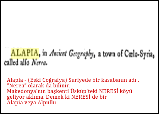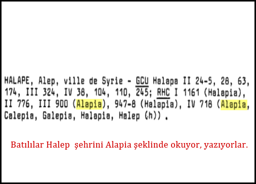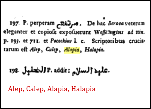 İspanyollar Halep şehrinden söz ederken Alpia sözcüğünü kullanıyorlar: "Passo el Eufrate (Fırat Nehri) y tomo la ciudad grande Alapia, y tomo en ella el Soldán llamado Malheruaia.aunque perdiomuchosTartarosa la prisión della."