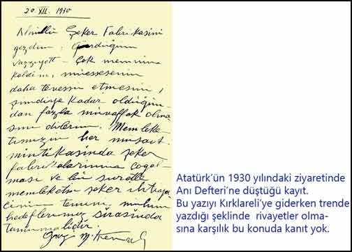 "Şahap Ege, Atatürk’ün geç saatlere kadar ilgililerden pancar ziraatı ve şeker sanayisi hakkında bilgi aldığını, geceyi trende geçirdiğini ve saat 10.00’da fabrika önünde duran vagonundan çıktığını, üzerinde spor bir elbisenin bulunduğunu, fabrikanın önündeki giriş yerine geniş bir merdiven yapıldığını Atatürk’ün buraya geldiğinde, O’nu Fabrika Müdürü Gutherz’in Almanca uzun bir konuşma ile karşıladığını ve fabrika hakkında bilgi verdiğini söylemiştir.