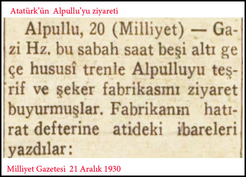 "...Saat 21.35’te trenle halkın tezahüratı arasında beraberinde kardeşi Makbule Hanımefendi, İçişleri Bakanı Şükrü Kaya, Afet İnan, Kütahya Milletvekili Recep Peker, Bolu Milletvekili Salih Bozok, Tahran elçisi, Ordu Müfettişi Sait Ali Paşa, Başyaver Rusuhi Bey, Hususi Kalem Müdürü Tevfik Bıyıklıoğlu, Muhafız Gücü Komutanı İsmail Hakkı (Tekçe), İçişleri Bakanlığı Özel Kalem Müdürü, Kolordu Kumandanı Şükrü Naili (Gökberk), Sinop Milletvekili Recep Zühtü (İnan), Rize Milletvekili Hasan Cavit, Gaziantep Milletvekili Kılıç Ali, Edirne Milletvekili Şakir Kesebir, Hasan Hayri (Tan), Zeki Mesut Aslan, Milli Eğitimden Hasan Âli (Yücel), İstanbul Liman Şirketi Müdürü Hamdi (Ahmet Hamdi Başar), Halk Fırkası Umumi Kâtibi Ziya (Gehver Etili), Sağlık Müşteşarı Hüsamettin, Anadolu Ajansından Kemalettin (Kamu-Şair), Maliye Müfettişi Nedim, Şifre Müdürü Suat, fotoğrafçısı Muzaffer, sinemacı Kemal Beyler ile Mustafa Kemal Paşa’nın yakın çevresinden gazeteci-yazar Ruşen Eşref’te Trakya’ya hareket etmişlerdir. Kaynak: http://www.kordelyahaber.com/haber/ilk-seker-fabrikamiz-alpullu-h2159.html