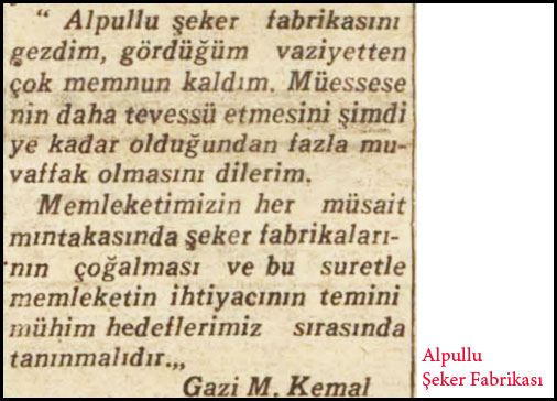 Atatürk'ün anı yazısı. Alpullu Şeker Fabrikası’nı gezdikten sonra Atatürk “Ergene Köşkü”nde bulunan “Anı Defteri”ne şu satırları yazmıştır: “Alpullu Şeker Fabrikasını gezdim. Gördüğüm vaziyetten çok memnun kaldım. Müessesenin daha tevsii etmesini ve şimdiye kadar olduğundan fazla muvaffak olmasını dilerim. Memleketimizin her müsait mıntıkasında şeker fabrikalarının çoğalması ve bu suretle memleketin şeker ihtiyacının temini mühim hedeflerimiz arasında tanınmalıdır.”