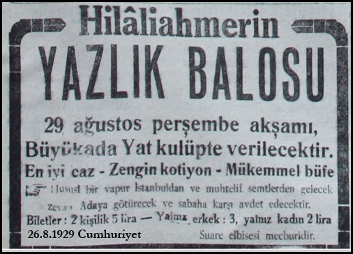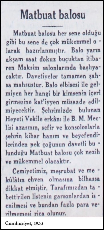 Cumhuriyet'in kuruluşundan sonra ilk resmi balo ise 1925 yılında düzenleniyor. 29 Ekim 1925 Cumhuriyet Bayramı kutlamaları çerçevesinde… Batı tandanslı bir eğlence türü... Yemek, müzik ve dans... Kadın erkek birlikteliği ve kahkahalar... Siyasal elitlerin buluştukları, içki içtikleri, kadeh kaldırarak eğlendikleri bir ortam... Okullara dans derslerinin konması...