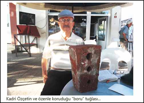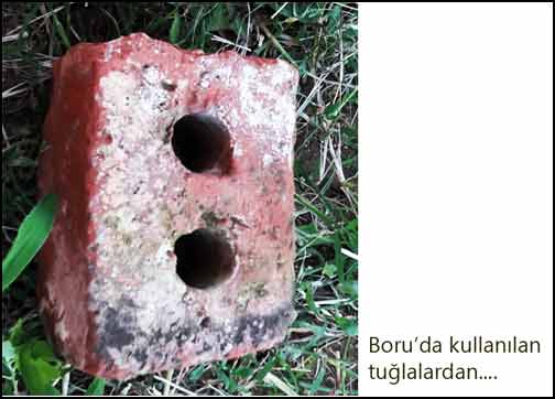 Tuğlaları mermer gibi sert idi. Bunlara "ateş tuğlası" deniyor, fakat özel kalite ateş tuğlası... Boru'nun yuvarlak olması ve giderek incelmesi nedeniyle tuğlalar özel olarak kalıplanmış ve özel olarak üretilmiş. İç tarafları daralan bir forma sahipti. Ve ayrıca birbirine kenetlenmeleri veya kilitlenmeleri için çentikleri vardı. Bahçemizdeki evi yaparken bazı tuğlaları ve taşları evin temeline atmıştık. Sanırım o tuğlalardan bir kaç tanesi bizim evin temelinde de vardır.