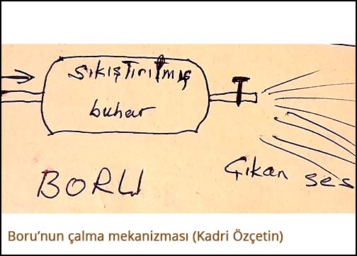 Kadri ağabey anlatıyor: Boru kampanya sırasında çalar, işçilerin fabrikaya giriş ve çıkışlarını gösterirdi. "Boru bağırıyor" denirdi ama aslında sesi çıkaran başka bir aygıt vardı. Kazan dairesinde, içinde sıkıştırılmış buhar bulunan bir tüpün ucuna takılmış bir supap vasıtasıyla ses üretiliyordu. Islık çalmaya benzeyen bir mekanizmayla çalışıyordu. (Sözün burasında kağıdı kalemi alıp aygıtın temsili bir resmini çizdi. Yan tarafta görülebilir).