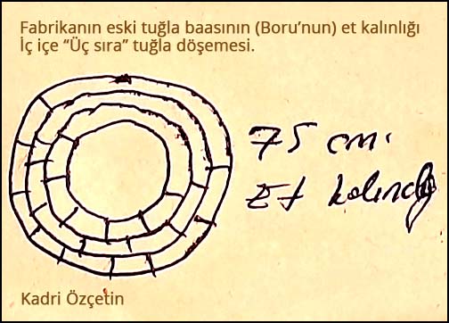 Kadri Özçetin ağabey tabanda çapının 6 metre, tepede ise 2,5 metre olduğunu bildiriyor. Baca içeriden iskele kurularak örülmüş. Kadri ağabey ilginç bir bilgi daha veriyor. Baca içe doğru üç sıra delikli tuğla ile örülmüş. "Et kalınlığı yaklaşık 75 cm idi" diyor ve ekliyor, "Bu kadar kalın olmasa, dayanmaz, o kadar yükü çekmezdi." Kadri ağabeye soruyorum: "Tuğlalardaki deliklerin belli bir işlevi var mıydı?" Cevap veriyor. "Bunu tam bilmiyoruz. Kurşun dökülmüş veya oraya harç konmuş olabilir."