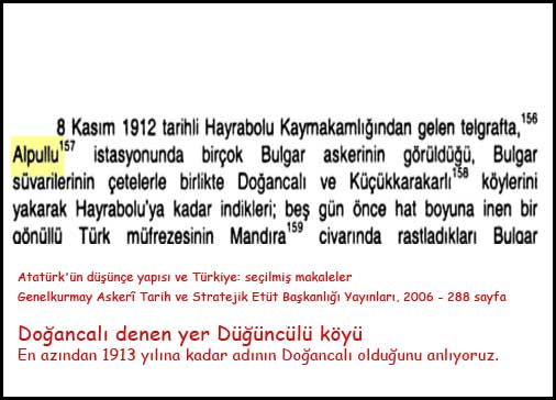 “Lüleburgaz’dan Babaeski’ye geldiğimiz vakit kasabayı muhacirlerin tamamen yağma ettiklerini gördük. Hatta Alpullu köyünde (Pancarköy) yerli Hristiyanlarla muhacirler arasında bir de çatışma olmuştu. Köy yakılmıştı. Sarıcaali Köyü yakınında yol üstünde beyinleri parçalanmış ve ellerinde sigara olduğu halde vefat etmiş askerleri gördük. Bunlar köylüler tarafından öldürülmüşlerdi. Biz de köyü yaktık. 29 Ekimde komite ocağı olan Hasboğa’da köylüler yaralı askeri öldürmüşlerdi. Hatta atlarımıza arpa almak için adı geçen o köye gittiğim vakit öldürülmüş subayların kanlı elbiselerini bulmuştum. Saray ve vize yolunda soğuk ve açlıktan ölmüş iki binden fazla asker saydım (s. 72)”.