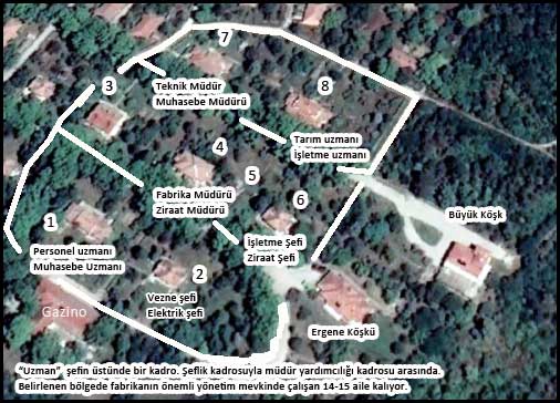 Köşklerin yakın çevresi müdür, müdür yardımcıları, uzmanlar ve şefler için ayrılmıştı. Burada, kimisi ikiz villa şeklinde düzenlenmiş sekiz yapı vardı ve binalarda toplam 14-15 hane kalıyordu.