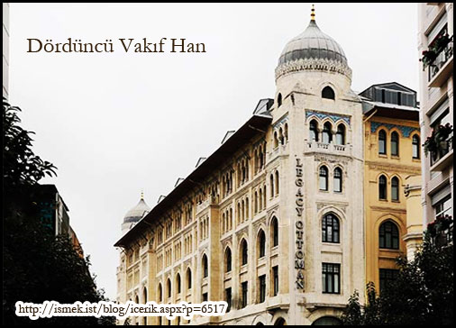 Eminönü'deki Yeni Caminin önünden Nimet Abla piyango bileti satıcısının bulunduğu sokaktan ileriye doğru ilerlerken sol tarafta kalan yedi katlı büyük bina. Mimar Kemalettin tarafından yapılmış. Bugünlerde Legacy Ottoman adıyla otel olarak kullanılıyor. Vakıflar Genel Müdürlüğüne ait olan binanın temeli 1911 yılında atılmış ve İlk Türk Milli Mimarisi olarak tanımlanıyormuş. Bina Sultan Abdülhamit tarafından yaptırılan dini birimlerden oluşan Hamidiye Külliyesinin yerine inşa edilmiş.