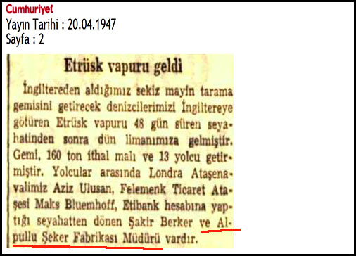1947 yılında İngiltere'den gelen gemide Alpullu şeker fabrikası müdürünün de geldiği belirtiliyor. O yıllarda Fevzi bey Alpullu'da müdür. Demek ki bir yurtdışı seyahati olmuş.