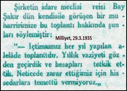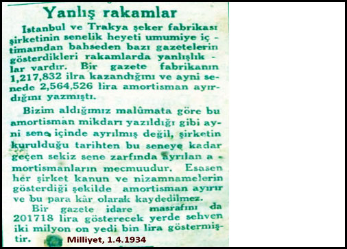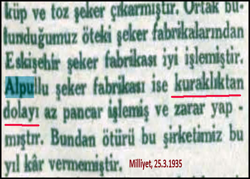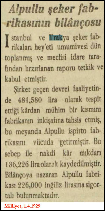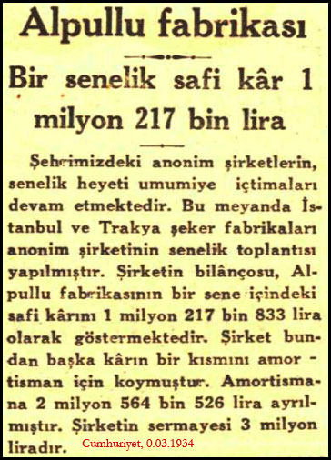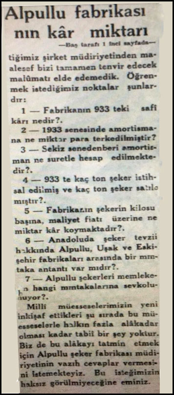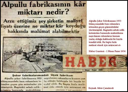 Cumhuriyet Gazetesi'nin 30.08.1934 tarihli haberine göre: "İstatistikler Alpullu seker fabrikasının 1933 senesinde köylüye ve pancar zürraina 4 milyon 125 bin, muhtelif vergilere 1 milyon 830 bin 861, memur ve amelesine 1 milyon 572 bin 637, nakliyat ve Şimendifere 710 bin 706, kömüre 482 bin 136, hissedarlara 450 bin, Tayyare, Hilâli-Ahmer (Kızılay) gibi hayır cemiyetlerine de 31 bin 743 lira verdiğini göstermektedir." Hissedara 450 bin lira ve köylülerin pancar parasından kesilerek tayyare ve Kızılay'a 32 bin lira.... Tayyare ve Kızılay için hissedarlardan ve yöneticilerden acaba ne kadar para kesildi? Bilmiyoruz. Kesilmiş olsa bile "haber değeri olacak" düzeye erişememiş denebilir.