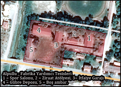 İlk bina Kapalı Spor Tesisi. İkincisi Ziraat Atölyesi... Üçüncü bina İtfaiye Garajı... Dördüncüsü Gübre Ambarı ve beşinci bina boş Depo...