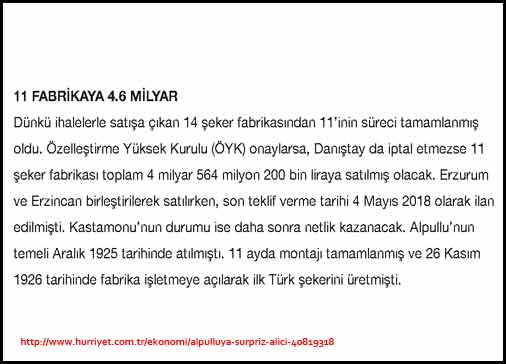 Fabrika 2009'da satılacakmış, satılmamış. Geri çekilmiş. 2011'de tekrar gündeme gelmiş. Bakanlar Kurulunun önüne gelmiş, kaldırılmış.