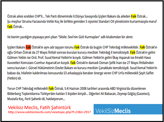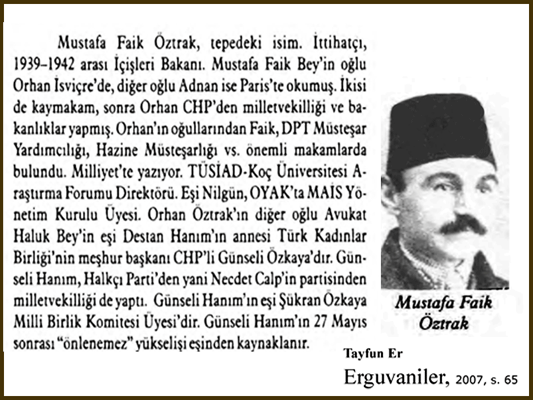 Tayfur Er "Erguvaniler" kitabında kendilerinden "Öztırak Hanedanlığı" şeklinde söz ediyor. Mustafa Faik Öztırak ittihatçı imiş. İki oğlu kaymakamlık ve CHP milletvekilliği yapmışlar. Çocukları ve eşlerinin ayrıntılı hikayesi ilgili kitapta... Mutlaka okunması gerek... TÜSİAD-Koç Üniversitesi, OYAK, MAİS, TRT Genel Müdürlüğü... Böyle devam ediyor (ss. 65-68). Er'in tanımlamasıyla onlar "iyi doğmuşlar" zümresinden gelen asil bir aristokrat ailesi...