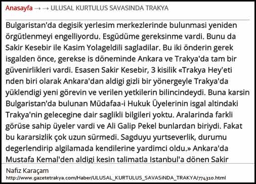 "Trakya kasaba ve kentlerin teslim alınmasına Trakya Paşaeli Müdafaai Hukuk Derneği üyelerinden Şakir (Kesebir) (Edirnelidir, Köprülü sülalesindendir. Edirne Valiliği'nden sonra Ardahan ve Kars Valiliklerinde bulunmuştur. Türkiye Kredi Bankası Genel Müdürlüğü yapmış, Cumhuriyet'in 15'inci yıldönümünde Türkiye İstisat Bakanı olmuştur) vazifelendirilmiştir."