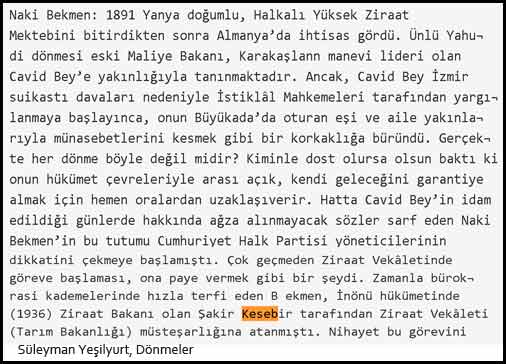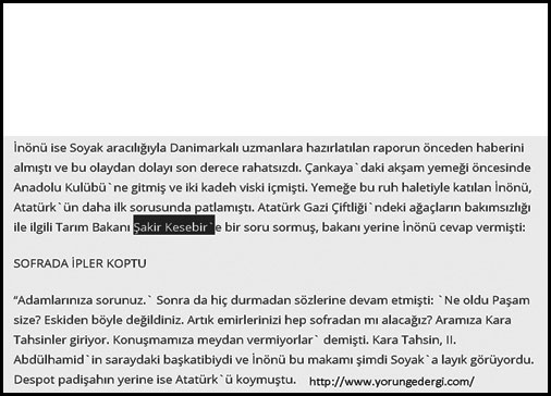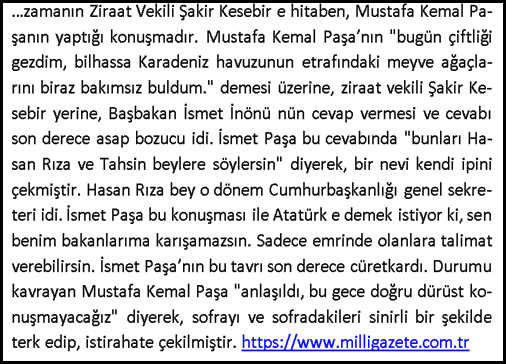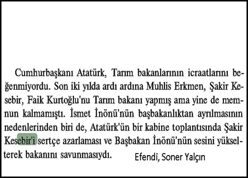 “Mesele etrafında cereyan eden dedikodular efkarı umumiyede şüpheli mecralara varan bir şekil aldı. Deniliyor ki Ankara tecrübelerine 3 traktör nümunesi arz edilmiştir. Ve bunların birisi Şakir Be İktisat Vekili oluncaya kadar ortağı olduğu Hayri Beyin hemşirezadesinin vekalet ettikleri fabrikalara aittir.