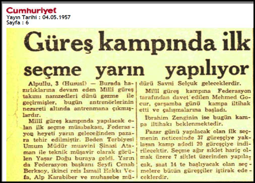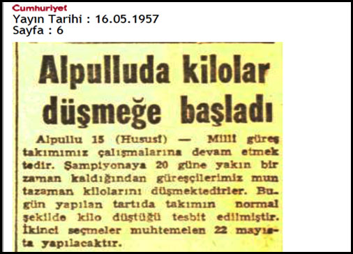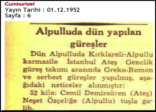 1952 yılında güreş müsabakaları yapılıyor. Cumhuriyet gazetesinde yayımlanan haber şöyle: Dün Alpullu’da Kırklareli-Alpullu karmasile İstanbul Ateş Gençlik güreş takımı arasında Greko-Romen ve serbest güreşler yapılmış, aşağıdaki neticeler alınmıştır: 52 kilo: Cemil Demirsüren (Ateş) Neşet Özçeliğe (Alpullu) tuşla galib. 57 kilo: Kemal Demirsüren (Ateş) Süleyman Yanardağa (Kırklareli) tuşla galib. 62 kilo: Hasan Ferruh (Ateş) Sinan Aksoya (Alpullu) tuşla galib - 67 kilo: Haşim Dal (Alpullu) Şeref Yığına (Ateş) tuşla galib. 73 kilo: Emin Rencber (Ateş) Emin Çiftliğe (Kırklareli) ittifakla galib. 79 kilo: Mehmed Türkmen (Ateş) Ahmed Topçuya (Alpullu) ittifakla galib. Ağır sıklet: Yılmaz Altınışık (Ateş) Elmas Avcıya (Kırklareli) ittifakla galib. Bu suretle Ateş kulübü Greko-Romende 6-1 galib gelmiştir. Serbest güreşte de Ateş kulübü takımı 4-2 kazanmıştır.