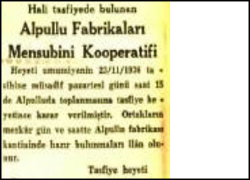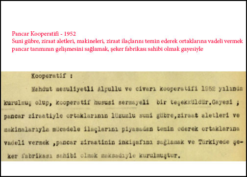 Alpullu'da iki tane kooperatif olmuş: Mensubin Kooperatifi ve Pancar Kooperatifi. O yıllarda sermaye birikiminin yetersiz olması nedeniyle hızlı kalkınmak için "kooperatif" sistemi üzerinde duruluyor. Bu kooperatiflere ait ayrıntılı bilgiler ilgili maddelerde....