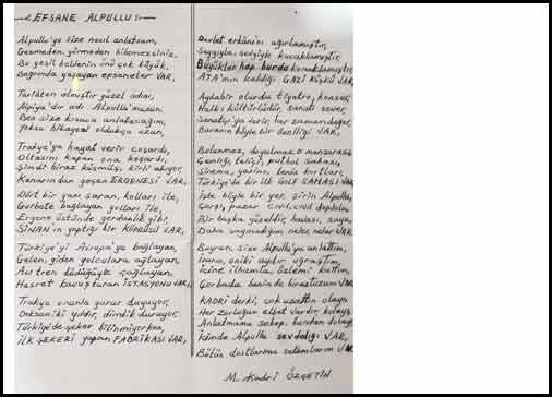 Alpullu hakkında yazılmış güzel bir şiiri var. "Alpullu Şiirleri" maddesinde değindim. Site incelendiğinde görülecektir ki neredeyse her maddede onun katkısı vardır. Sadece bilgi açısından değil, temin ettiği fotoğraflar, krokiler, çizimler açısından da... Kendisinden temin ettiğim bilgilerde atıflarım vardır. Gözden kaçırdığım veya sehven atıf yapmayı ihmal ettiğim bilgiler varsa affımı istirham ederim.
