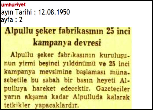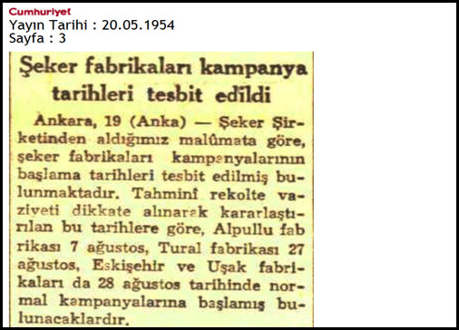 1955-1956 kampanyasına başlamış ve yeni mahsulden ilk pancar getiren köylüye merasimle bir kol saati hediye edilmiştir.