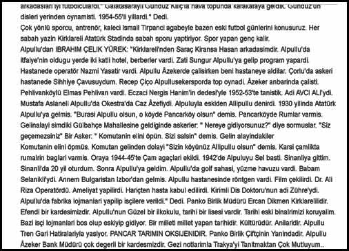 Kemal Çıkla (Saray'da oturuyor, fabrika eski çalışanı. Ham fabrikada tepir ustası olarak çalışmış. Fakat asıl mesleği postacılık. Dokuz sene Alpullu ve sonra 17 sene Pehlivanköy postanesinde çalışmış. Postacı Kemal veya Arap Kemal lakabıyla tanınıyor).