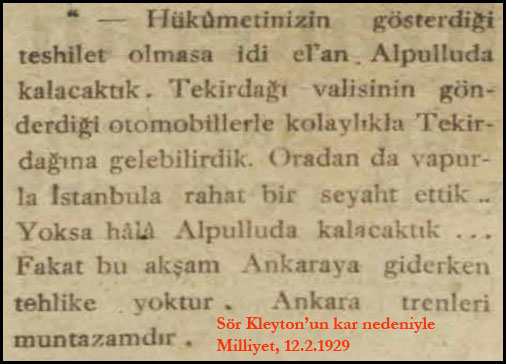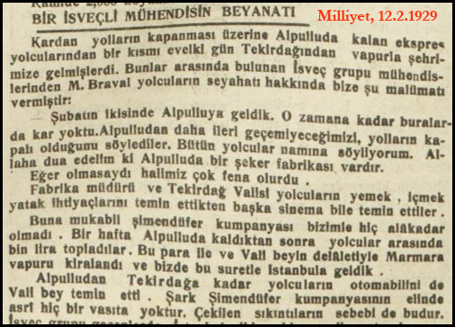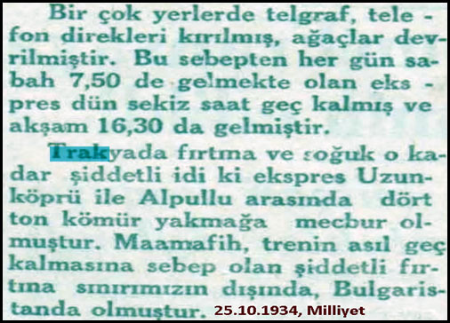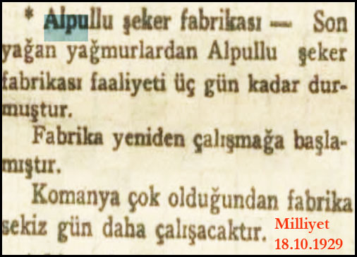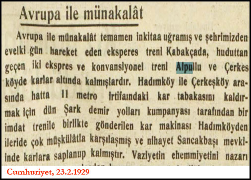 1929 yılında Oryent Ekspres, yani Doğu Ekpresi Ocak ayında Paris'den yola çıkıyor. Alpullu civarına geldiklerinde kara saplanıyorlar. Dışarıda hava -25 derece. Tipi ve kar var, göz gözü görmüyor.... Şeker fabrikasının işçileri tren yolcularının imdadına yetişiyor ve treni saplandoığı kardan çıkarıp kurtarıyorlar. Bu olay daha sonra İngiliz yazar Agasta Christie'eye "ilham veriyor" ve 1934 yılında "Trende Cinayet" (Murder on the Orient Express) adlı romanını yazıyor. Kırk yıl sonra Kasım 1974'te söz konusu romanın filmi çevriliyor. Roman ve filmdeki kar sahneleri ve coğrafya ortamı Alpullu'yu yansıtmaktan uzak olmakla birlikte bu olayın "esin kaynağı olması" önemli...