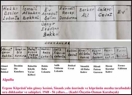 Alpullu'dan Necla Türker anlatıyor: "Alpullu Köprü'nün öte tarafıydı. Köprüyü Sinanlı'ya doğru geçtikten sonra orada, yolun iki tarafına dizilmiş 30-35 hane vardı. İki lokanta, iki fırın, berber, bakkal dükkanı vardı. Yoğurtçu, meyhaneci, Ayakkabıcı Sahar, Ahmet Şener.... Bu tarafta bir tane fabrikanın evi vardı. Bir de Demiryolualtı evleri vardı. Onlar Köprü'nün sağ tarafındaydı. Köprüye doğru giderken Ergene'nin sağ kenarında Askeriye Kışlası varmış. Ayrıca eski Sinanlı yolu üzerinde Sinanlı'ya yakın bir tepenin üzerinde fabrikanın iki hane evi vardı."