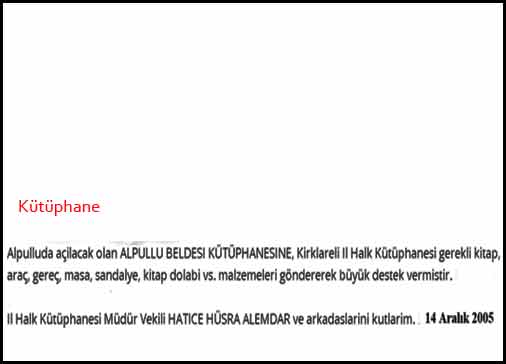 Kütüphane için yeni girişimler var. Nasıl sonuçlanacak merak ediyoruz. İlkokul ve ortaokulun herhalde kendi kütüphaneleri vardır. Kütüphane esas "halk" için gerekli. Fakat bizde Halk Kütüphanesi kavramı oturmamıştır. Şundan dolayı. Toplumumuz kütüphanelerin öğrenciler için gerekli olduğunu düşünür. Yetişkin "halkın" kütüphaneye gitme sorunu yoktur... Tüm Türkiye'de durum böyledir.