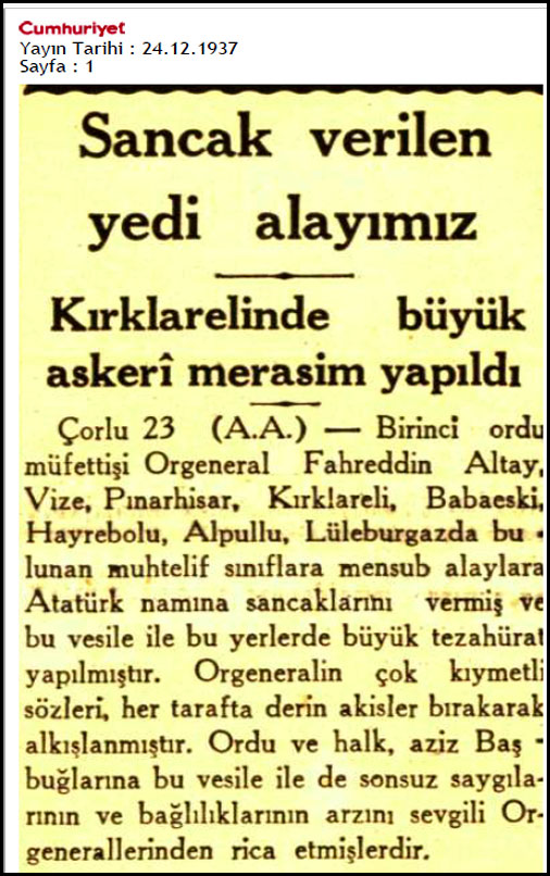 Alpullu'ya 1934 yılında gelmişler. Birinci Süvari Tümeni'ne bağlı imişler. Süvari, topçu ve piyade olmak üzere üç taburdan oluşuyormuş. Üç bölük bir araya geliyor bir "tabur" çıkıyor ortaya ve üç tabur da bir "alay"ı meydana getiriyor. Bir bölükte 100 kişi olsa, taburda 300 ve alayda 1000 civarında er var demektir. Alay komutanı Albay Emin Ünal imiş o vakitler...