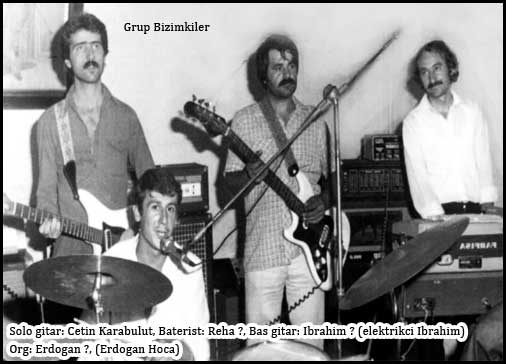 Grup Bizimkiler. Kurulus tarihi 1981. Grup üyeleri soldan sağa: Solo gitar: Çetin Karabulut, Çetin abi halen Istanbulda müzisyenliğe devam ediyor. Boğazda nezih bir mekanda çalışıyor. Baterist: Reha ?, Reha abi kısa süre öncesine kadar Hayrabolu´da yaşamını sürdürdü. Reha abiyi kısa süre önce (2005) genç yasta kaybettik. Bas gitar: İbrahim ? (Elektrikçi İbrahim), emekli oldu ve Alpullu´da elektrikçilik yapıyor. Org: Erdoğan ?, (Erdoğan Hoca), öğretmenlikten emekli oldu, şu an İstanbul´da yasıyor. Bu fotoğraf sendika lokalinde çekilmiştir.