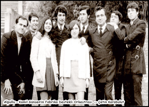 Kamil Günsenin Orkestrası. Alpullu Seker Orkestrası Alpullu´nun ilk orkestralarından 1960'lı yıllarda kurulmuş. Grup üyeleri: Solo gitar: Kamil Günsenin (iki kızın arasında), Seker sigortadan emekli oldu. Şu an İstanbul´un çeşitli orkestralarında müzisyenlik yapıyor. Saksafon: Kemal Saraçlar (sağdan üçüncü), kantinde çalışıyordu emekli olduktan sonra Edirne´ye yerleşti. Org: Bahadır Akbulut (sağdan birinci) Bas gitar: ilhan sertkaynak (sağdan dördüncü). Baterist: Ömür Igret ( sağdan ikinci), müzisyen Uğur Iğret'ín abisi onu da maalesef kaybettik.
