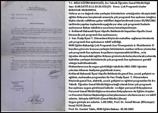 Kırklareli Babaeski İlçesi Alpullu Beldesinde genel lise, çocuk gelişimi ve eğitimi, muhasebe programları ile Van Özalp İlçesi Y. Döneredere Köyünde genel lise, elektrik, çocuk gelişimi ve eğitimi programları ile Kız Teknik Öğretim Genel Müdürlüğüne bağlı olarak birer çok programlı lise açılması uygun görülmesi halinde ve diğer personel ihtiyaçlarının Personel Genel Müdürlüğünce donatım ihtiyaçlarının da Eğitim Araçları ve Donatım Dairesi Başkanlığınca karşılanmasını olurlarınıza arz ve teklif ederim.