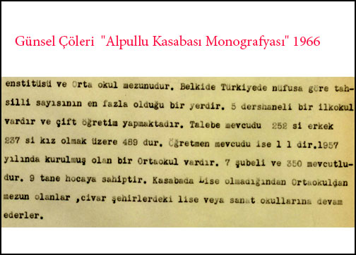 1967 yılında Alpullu Ortaokulu Öğretmenleri: Refik doğru (fen grubu), Sami Altın (Tarih), Öznur Van (Tarih), Serpil Sevinç (Edebiyat), İbrahim Özkurt ((Fen), Yücel Sevinç (Fen), Kemalettin Tiryakı ((Beden Eğitimi), Mualla Utkan (Resim-İş), Yükselen Yeşildağ (Ev-İş), Hasköy'lü Hüseyin Çamyan (Memur).
