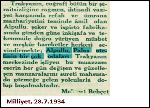 Milliyet gazetesinin 1934 tarihli haberinde otelin "Alpullu Palas" olarak nitelendirildiğini görüyoruz. Palas denmesinin sebebi büyük ve görkemli bir yapı olması. Monoblok yapıda otel ve gazino birimleri var.