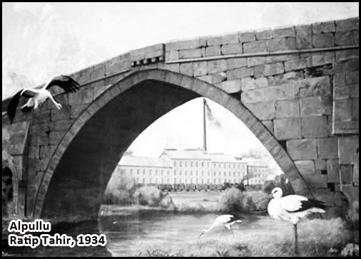 Yorum yapılıyor... "Ratip Tahir bu tabloları Sinanlı'nın oradaki kum tepelerine oturmuş, Alpullu'ya bakarak yapmış. Üç kilometre uzaktan ne gördüyse tuvaline işlemiş." Herhalde oraya da oturmuştur ama resimlerin niteliğine bakarsak, onların değişik pozisyonlarda yapıldığı açık. Köprü resimlerini o tepeden çizmesi imkansız... Ve sonra bazı resimlerin önceden çekilmiş siyah-beyaz fotoğrafları var. O fotoğraflara bakılarak çizdiği aşikar.