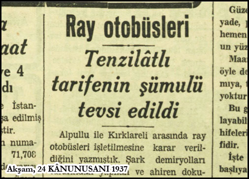 "Alpullu ve Kırklareli arasında ray otobüsleri işletilmesine karar verildiğini yazmıştık. Şark demiryolları tarafından yapılan ve ahiren dokuzuncu işletme müdürlüğünce tatbik edilmekte olan tenzilâtlı tarifeden ray otobüsleri yolcularının ne şekilde istifade edeceklerine dair bir tarifname hazırlanmıştır. İstanbul, Uzunköprü, Kırklareli, Alpullu tren biletlerinde yalnız gitme için ve gündüzleyin seyahat etmek şartı ile yüzde 30, gidip gelme biletlerde ise yüzde elli tenzilât yapılmıştı. Gece seyahat edenler arasında İstanbul’dan Edirne’ye, Edirne’den İstanbul’a; Edirne’den Alpullu’ya, A Alpullu’dan Edirne’ye gidenler bu yüzde elli tenzilâttan istifade edebileceklerdir. Ray otobüsleri ile Edirne’den Kırklareli’ne seyahat edecek olanlar Edirne’den Alpullu’ya kadar bir ve Alpullu’dan da Kırklareli’ne gene başka bir bilet aldıkları takdirde tenzilâttan müstefit olabileceklerdir. Ayni şekilde Kırklareli’nden İstanbul’a veya Edirne’ye seyahat etmek isteyenler de gene Alpullu’da bilet değiştirdikleri takdirde ucuz seyahat edebileceklerdir."