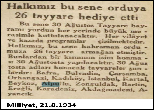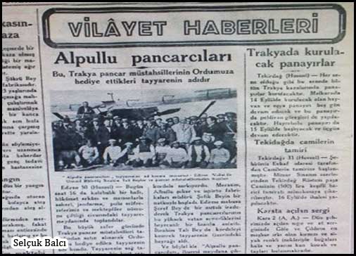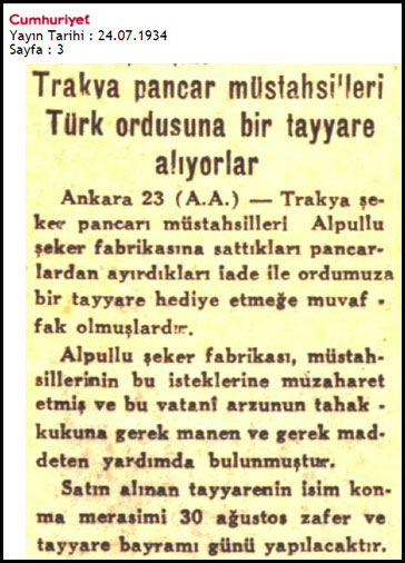 Ayin Tarihi, 7-8. sayılar, 1934 isimli kaynakta şöyle geçiyor: "Trakya şeker pancarı müstahsilleri, Alpullu Şeker Fabrikasına sattıkları pancarlardan ayırdıkları iane ile orduya bir tayyare hediye ettiler. Tayyarenin isim konma merasimi 30 Ağustos Zafer ve Tayyare Bayramı günü yapılacaktır (s. 11)."