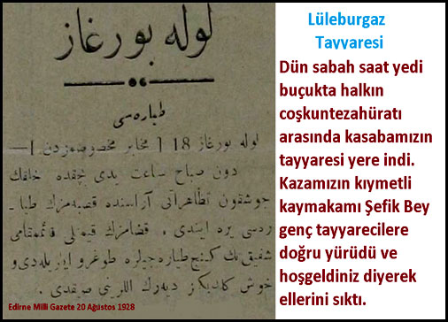 Filo Kumandanı Ekrem Beyle görüştüm. Trakyalıların tayyareciliğimize gösterdikleri samimi alakadan dolayı çok çok mütehassis olduğunu söyleyerek şu cümleleri ilave etti;