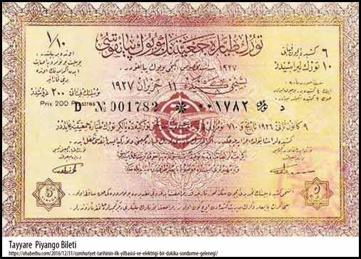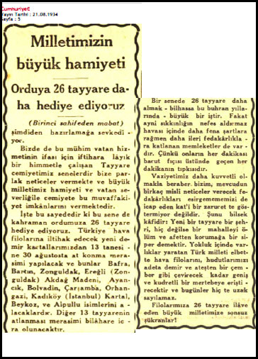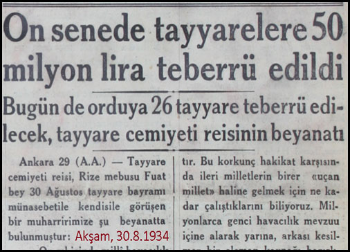 Bilumûm dâhiliye me'mûrları her ay maaşlarından yüzde bir guruş teberru'nu taahhüd itmişlerdir. Toplanan meblağ ile bir tayyâre satun alınacakdır. Haber Gazetesi, 27.7.1925