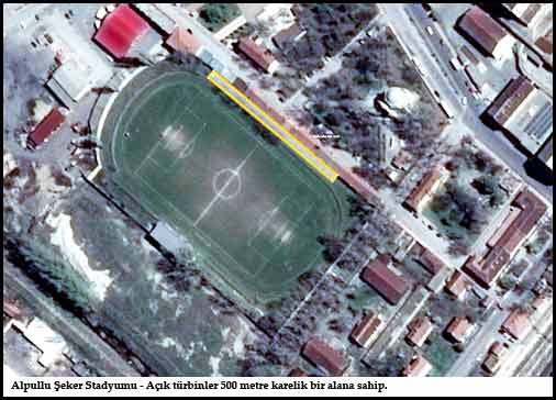 On dokuz dönümlük bir alan... Yaklaşık 20 dönüm diyelim. Dörtyüz metrekarelik kapalı bir türbine sahip. Uzunluğu 32 metre ve genişliği 11 metre... Yüksek türbinlere merdivenlerle çıkıyorsunuz. Altında futbolcuların soyunma odaları, banyo ve tuvaletler var. Ve karşı tarafta açık türbinler... Orası 500 metre karelik bir alana sahip, betondan yapılmış.