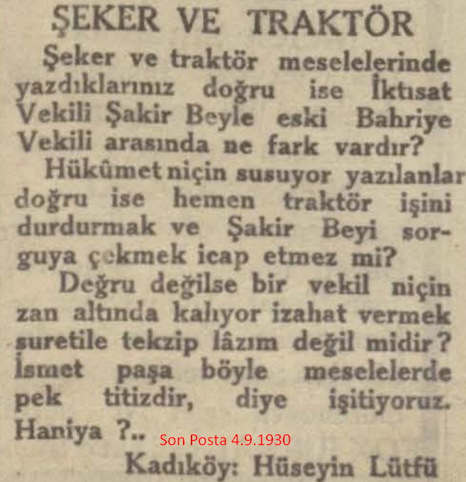 Traktör siyaseti şimendifer siyaseti gibi memlekete nafi bir cephe arz eder. Lakin öteki nasıl bir zaman gelip taşıyacak şey bulamamak yüzünden yakacak kömür bulamayacaksa traktör de fena bakım, azami istihsalin ademi temini ve saire yüzünden istirahati ebediyyeye varmak için yatacak köşe arayacaktır. Bu gün Anadolu’nun köşe bucağında para yüzü görmeyen köylünün parasını Avrupa’ya nakle sebep olduktan sonra uzanmış yatmış traktör enkazı bizim adil şahitlerimizdir.