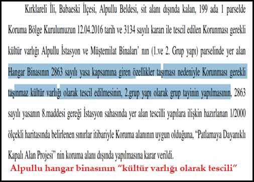 Tren hangarı tarihsel özelliği nedeniyle Edirne Koruma Kurulu tarafından 12.04.2016 tarih ve 3134 sayılı kararı ile "Kültür Varlığı" ve "ikinci grup yapı" olarak tescil edilmiş... Bu da güzel bir gelişme. Yani yıkılmayacak, bozulmayacak... Tren hangarına cer su pompası ve su deposu da ilave edilmeli... Çünkü hepsi bir bütün...