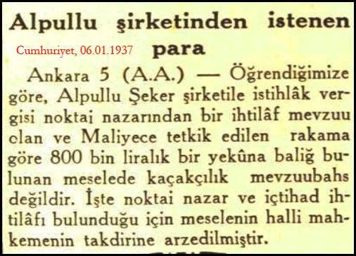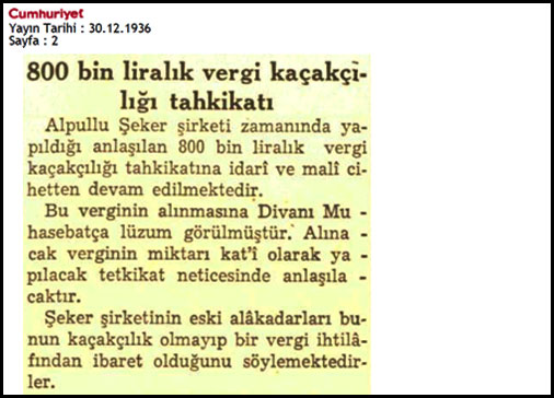 20.12.1936 tarihli Cumhuriyet gazetesi haberinde Alpullu Şeker Şirketi zamanında 800 bin liralık vergi kaçakçılığı yapıldığı iddiası dile getiriliyor. Bu konuda inceleme ve araştırma yapılmasına karar verilmiş.