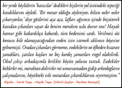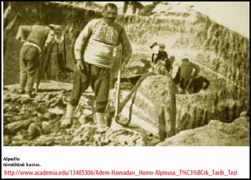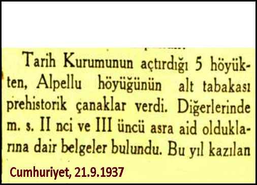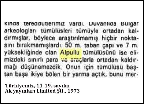 "50 m taban çapı ve 7 m yüksekliğinde olan Alpullu tümülüsünü elimizdeki sınırlı para ve araçlarla ortadan kaldırmayı düşünemezdik. Onun için tümülüsü baştan başa ikiye bölen bir yarma açtık, bunu merkeze doğru genişletmek suretiyle derinleştir- dik. Fakat dıştaki toprak düzeyine indiğimiz halde mezarla ilgili hiçbir ize rastlamadık. Buna karşılık tabii zeminin 25-30 cm aşağısında ev kalıntılarına ait oldukları anlaşılan kerpiç kitleleri ve bunların arasında bir hayli çanak çömlek kırığına rastladık. Siyah, gri ve toprak renginde olan ve bazılarının üzerinde çizgilerle gösterilmiş geometrik süsler bulunan elde yapılmış ve perdahlanmış seramik parçalarından birkaç tanesini terkip etmek suretiyle vazo şekilleri hakkında da bir fikir edinebildik ve gördük ki tümülüsün altında prehistorik bir yerleşme yeri vardır; vazolar, teknik ve şekilleri bakımından, Macaristan'ın birçok yerlerinde bulunan ve «Toçe kültürü» olarak adlandırılan bronz çağı başları kültür tabakalarında bulunan seramikler ile dikkate değer bir benzerlik göstermekte ve M.Ö. " Kaynak: Türkiyemiz, 11-19. sayılar, Ak yayınları Limited Şti., 1973.