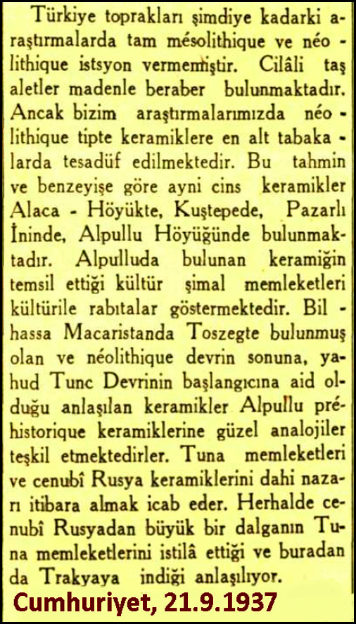 Bilhassa Macaristan da Toszegte bulunmuş olan ve néolithique devrin sonuna, yah ut Tunç Devrinin başlangıcına aid olduğu anlaşılan keramikler Alpullu préhistorique keramiklerine güzel analojiler teşkil etmektedirler. Tuna memleketleri ve cenubî Rusya keramiklerini dahi nazarı itibara almak icab eder. H erhalde cenubî Rusyadan büyüle bir dalganın Tuna memleketlerini istilâ ettiği ve buradan da Trakyaya indiği anlaşılıyor.