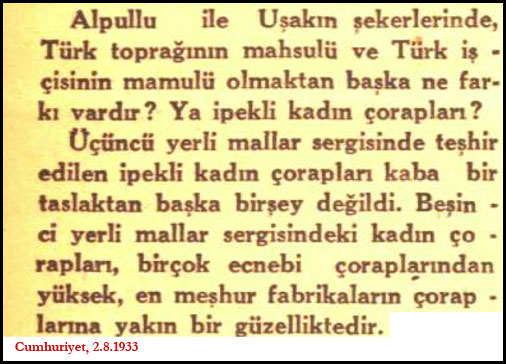 Devlet Yerli Malı olgusunu stratejik bir politika haline getirmişti. 1929 yılından itibaren her yıl "Yerli Malı Sergileri" düzenleniyordu. 1933 yılında İstanbul'daki Galatasaray Lisesi'nde yapılan sergiye Alpullu Şeker Fabrikası da katılmış ve bu sergide Ratip Tahir Beyin yağlı boya tabloları da sergilenmişti. Bu tablolar için bk. "Yağlı Boya Tablolar" maddesi.