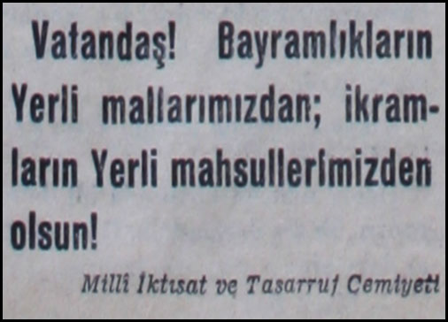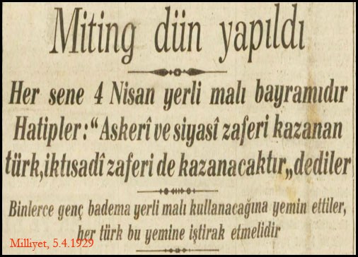 Yerli malı uygulaması 9 Aralık 1925 tarihinde kabul edilen Yerli Kumaştan Elbise giyilmesi kanunuyla başlıyor. 1926 yılının başında İzmir'de "Yerli Mamulatı Müstehlikler Cemiyeti" kuruluyor. 1929 yılında İstanbul'da "Yerli Mallarını Koruma Cemiyeti" faaliyete geçiyor. Daha sonra bu iki cemiyet "Milli İktisat ve Tasarruf Camiyeti" adı altında birleşiyor. 1929 yılından itibaren her yıl Aralık ayının 12'si ile 19'u arasındaki yedi gün "Yerli Malı ve Tasarruf Haftası" olarak kullanılıyor.