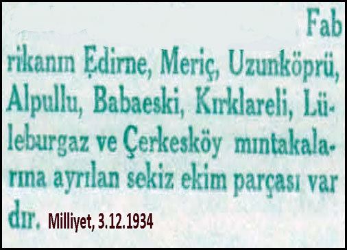 1934 yılında 8 ekim bölgesi belirlenmiş: Edirne, Meriç, Uzunköprü, Alpullu, Babaeski, Kırklareli, Lüleburgaz ve Çerkezköy mıntıkaları..