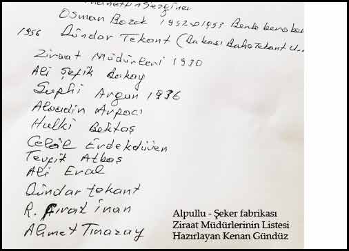 Listede yıllar verilmemiş. Ziraat müdürlerinin bir kısmı daha sonra fabrika müdürü olmuşlar. Bulabildiğimiz ve tespit edebildiğimiz kadar ziraat müdürlerinin adlarını da çıkarmak istiyoruz. Çünkü bu kişiler fabrika müdürüyle aynı blokta kalıyorlardı ve bir yerde fabrikadaki ikinci adam konumundaydılar.